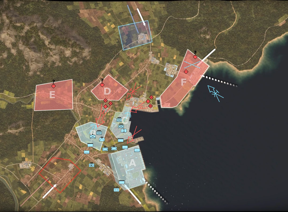 Przeciwnik ulokował się w punktach Echo, Delta i Foxtrot. Foxtrot służył jako punkt połączenia z bazą przeładunkową, z której kierowano całość wsparcia i zaopatrzenia. Jego neutralizacja pozwoliłaby na odcięcie przeciwnika od reszty oddziałów. Plutony piechoty zmechanizowanej, wyposażone w granatniki przeciwpancerne oraz wozy bojowe CV380 Grizzly zostały skierowane w tereny zabudowane aby zająć budynki i związać walką wrogie oddziały przemieszczające się zarówno w terenie zabudowanym między punktami Delta i Bravo, ale także i w porcie (Charlie). Na tyłach jako wsparcie zostały umieszczone wyrzutnie przeciwlotnicze AAV Arrow, które zapewniały obronę nieba przed nieprzyjacielskimi myśliwcami oraz helikopterami. Oprócz tego dodatkowe wsparcie przeciwlotnicze zapewniała drużyna piechoty, wyposażona w wyrzutnie pocisków ziemia-powietrze.