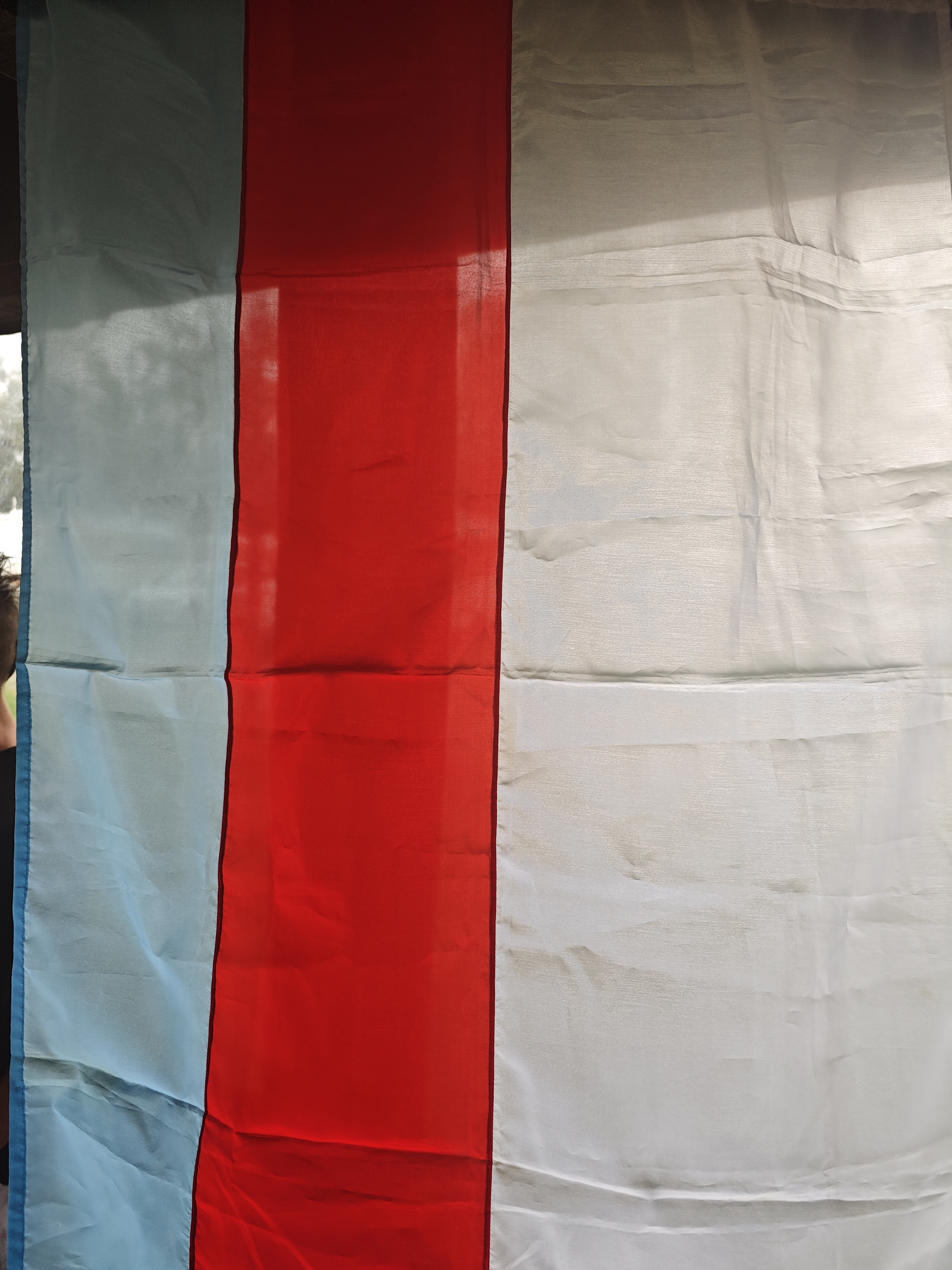 Helwetyk wyjaśnia - to pierwsza, historyczna flaga. Osoba, która ją szyła, nie miała akurat ciemnoniebieskiej nici, stąd taki efekt. Ale za to jest! Chwała mu za to!