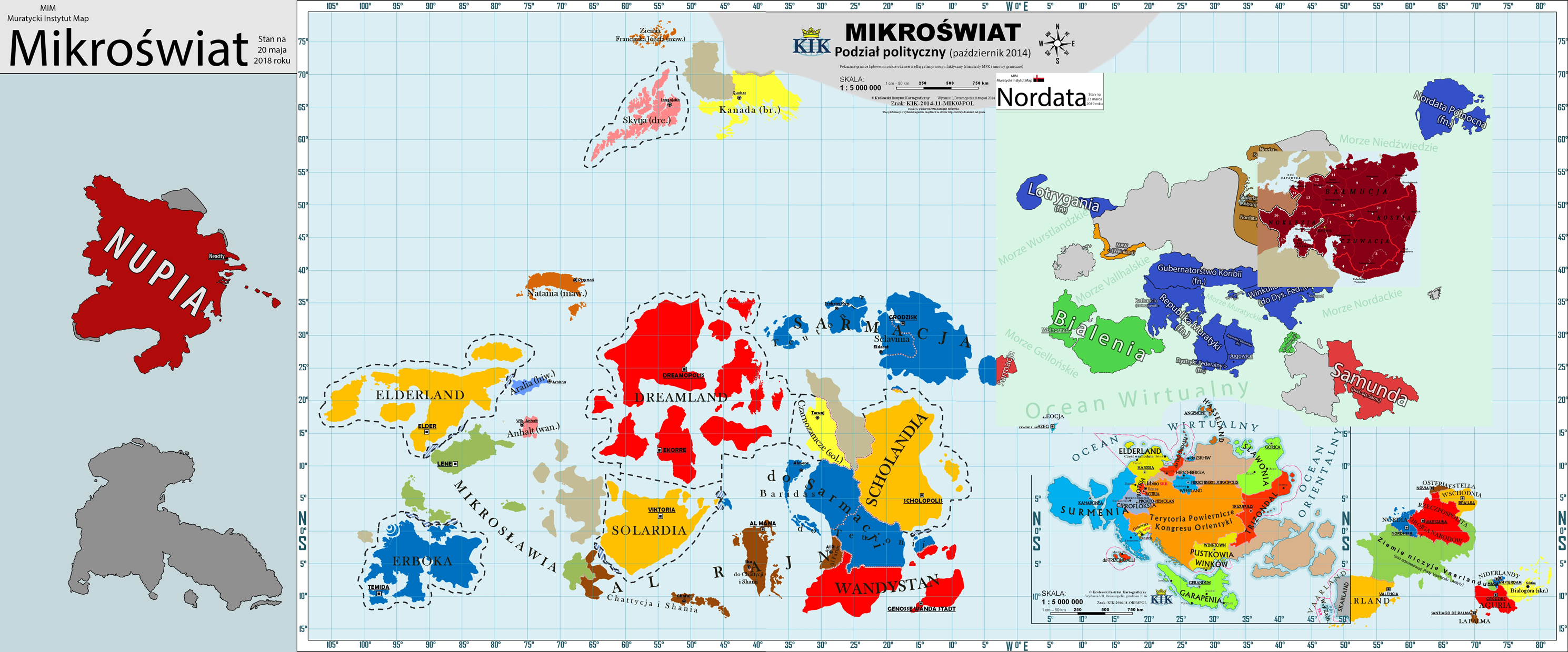 Jak napisałem... mnie również wystarcza dokonanego swego czasu odtworzenie aktualnych lądów Mikroświata. Dla celów własnych po prostu gdy potrzebuje jakieś miejsce oznaczyć to sobie wstawiam i tyle. Najważniejsze było otworzenie lądów, uwzględniając (jak się dało, bo niektóre v-kraje w ogóle się wielkościami nie przejmują i nawet nigdy dla własnych potrzeb tego nie zrobiły) wielkości lądów oraz wielkość globu (obwód 40 tys. km).Helwetyk Romański pisze: ↑12 gru 2020, 12:20Powyższe podkreślenie i mnie skrajnie zniechęca, w połączeniu z odtwarzaniem granic lądowych. Dlatego na mojej mapie Brodria ma częściowo zgodny z wcześniejszymi źródłami przebieg linii brzegowej, a częściowo nie — skleiłem na tyle, żeby wystarczyło do ustalenia odległości od Nowego Brzegu.